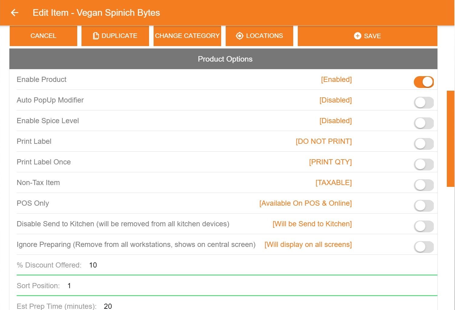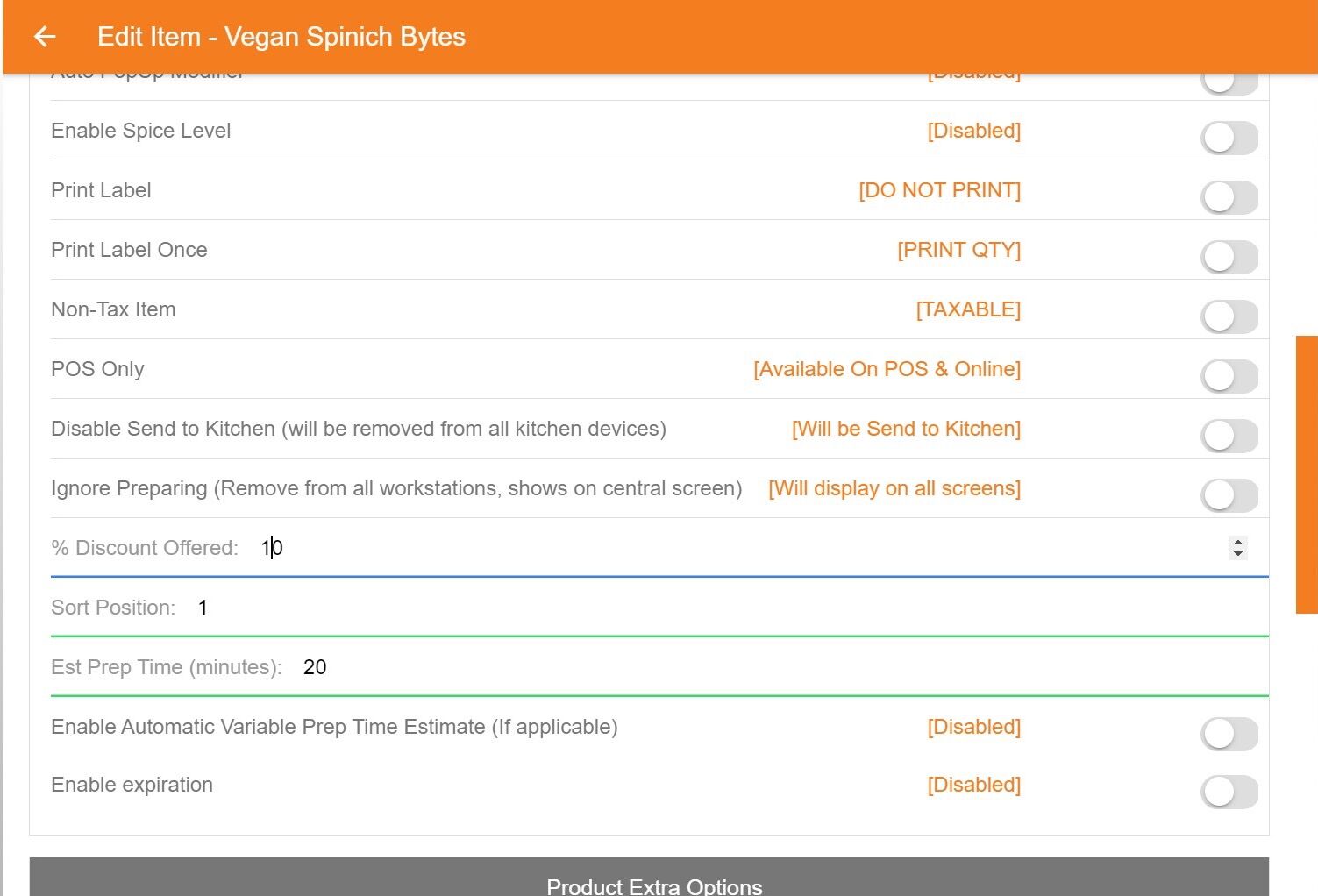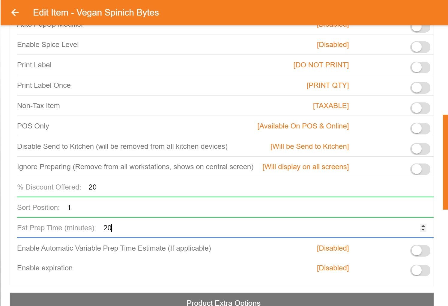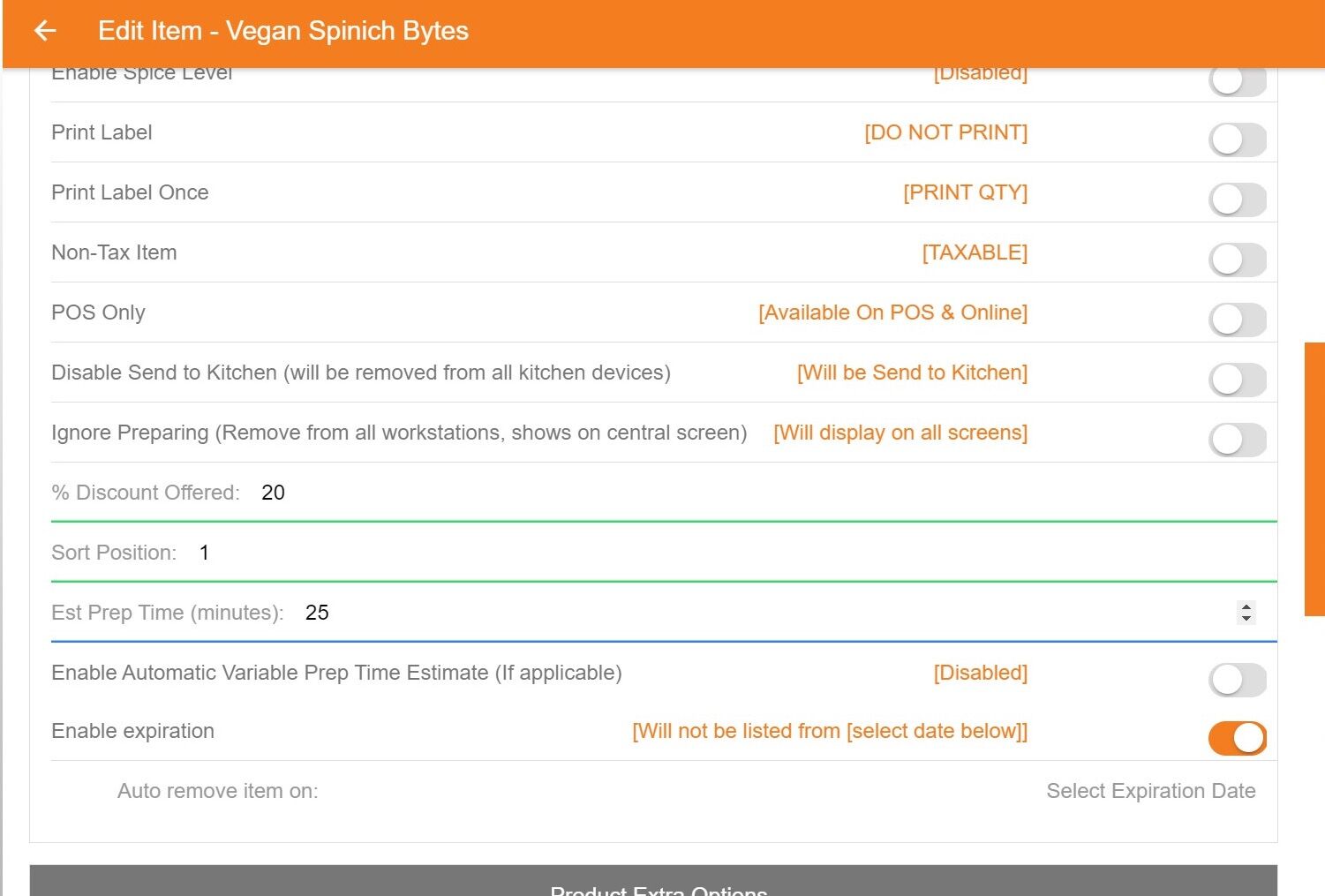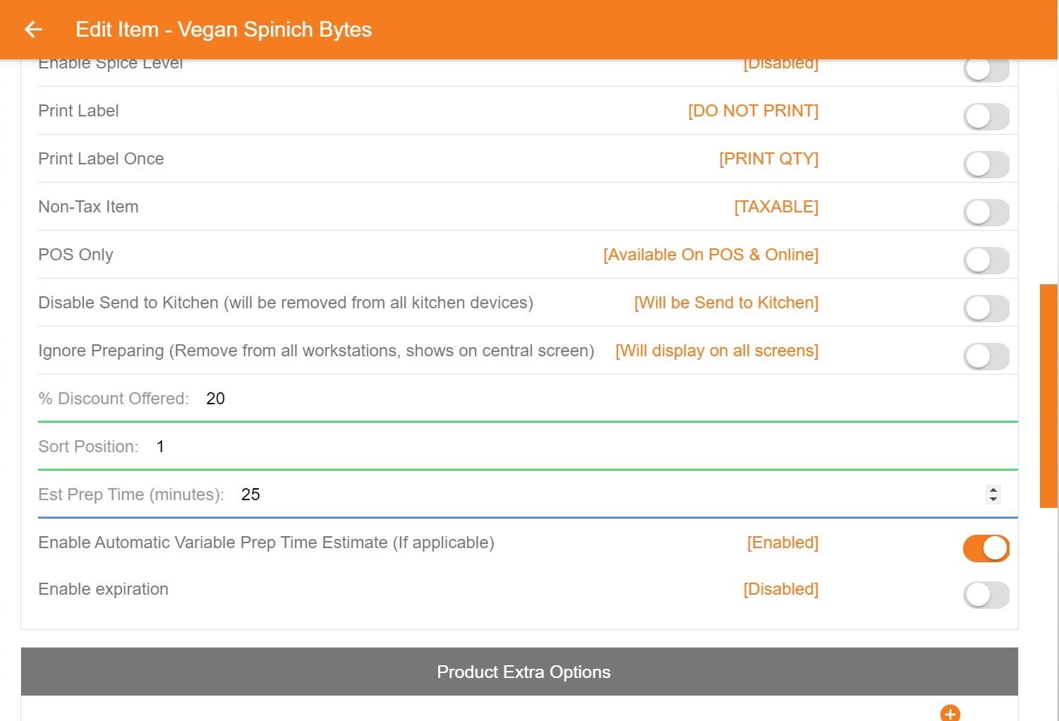 guide provides step-by-step on how to navigate and utilize various product options. It covers a range of such as enabling/disabling modifiers, spice levels, labels, tax exemptions, POS, kitchen preparation settings, discounts, prep time, expiration dates, and more. By following this guide, users can efficiently customize and manage their product options to enhance their restaurant operations.